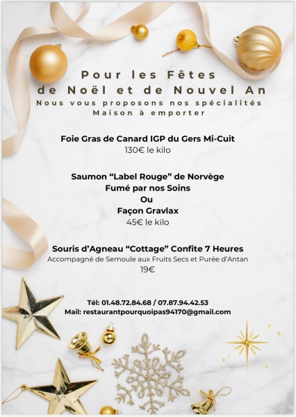 Pour célébrer les fêtes de fin d'année, Pourquoi Pas? est ravi de vous proposer une sélection exclusive de spécialités à emporter. Élaborées avec soin par notre chef, ces créations culinaires apporteront une touche de gourmandise et de raffinement à vos tables de fête. Que ce soit pour un repas en famille ou entre amis, nos plats sont conçus pour ravir vos papilles et celles de vos convives.